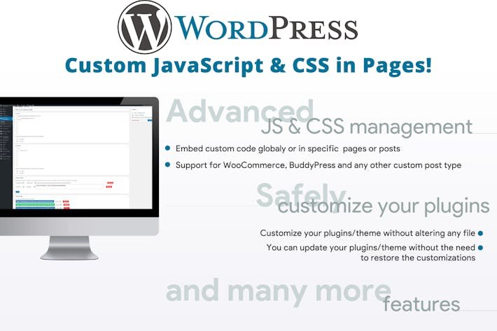The plugin allows you to embed CSS and Javascript code into any page (or just in the selected ones). It can be done through the Global code feature or directly by editing the page/post/custom post you need. Main features: